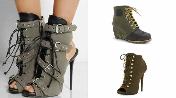 Обувь выбирают практичную и удобную. Идеально подходят высокие узкие сапоги на устойчивом каблуке или платформе, матовые туфли со стальными клепками, кожаные ботильоны. Военный стиль не обходится без шнурованных армейских ботинок или байкерских гриндерсов на толстой массивной подошве.