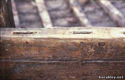 на фотографии — реставрированная часть корпуса торгового судна найденного в 80-х годах XX века в итальянском городе Комачо. Здесь наглядно показан метод стыковки поясьев наружной обшивки корабля. На торце верхнего пояса видны пазы, чуть ниже отверстия для нагелей