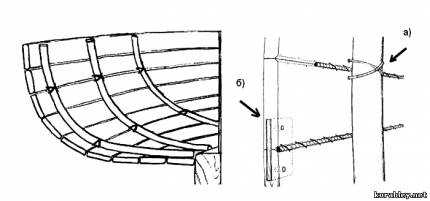 а) крепление обшивки к шпангоутам с помощью сшивки;