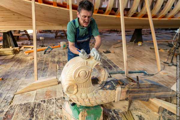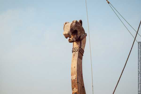При входе в ангар я сразу увидел резчика по дереву, который вытачивал вот такую голову — носовое украшения корабля.