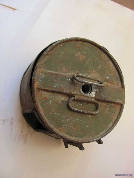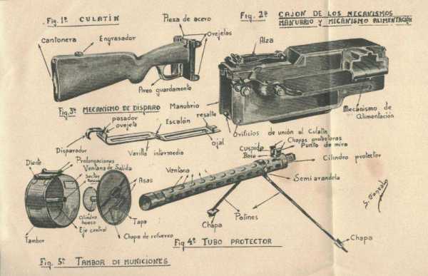 Питание патронами осуществляется из холщовой ленты на 100 патронов, которая заключалась в барабан.