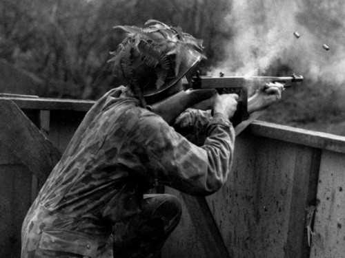 Американский солдат ведет огонь из Томпсона, учебная база на Гавайях 1944 год
