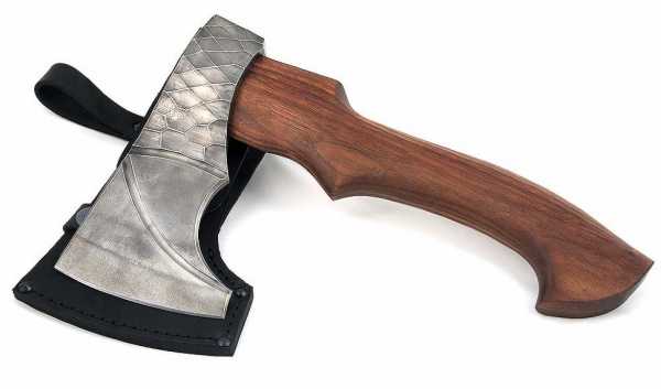 Топор с металлическими вставками на топорище и прошитым чехлом из кожи.