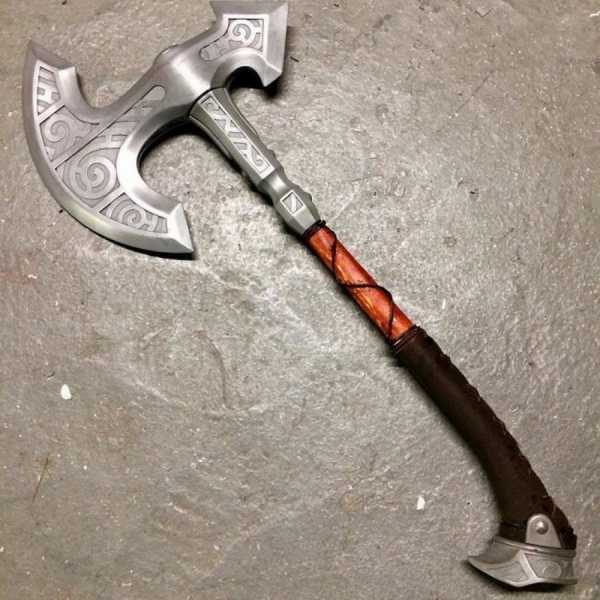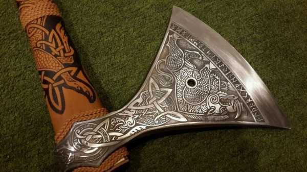 Боевое оружие украшено сложной гравировкой вепря,узорами и рунами, рукоять обтянута кожей.