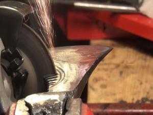 ШАГ 1: старый топор. Находим старый топор, и приводим его в чувства. Первым делом нужно выбить старую рукоять с топора. В большинстве случаев это не приносит особого усилия – с годами дерево ссыхается, и рукоять сама выпадает с топора. Теперь нужно зачистить сам топор от вековой ржавчины. Чтобы отчистить старый топор от грубой ржавчины, нам понадобится УШМ с зачистным кругом. Фиксируем его в тисках, проходим все поверхности топора, и определяем целостность металла. Если на нем были обнаружены подозрительные трещины, то их нужно обязательно заварить сваркой (или же найти целый топор) потому, что в дальнейшем наш топор викингов может просто лопнуть в том месте. После сварки необходимо зачистить все сварные швы под ноль.
