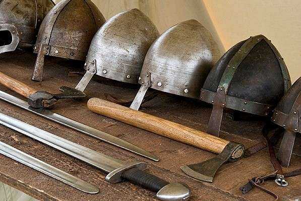 Шлемы как и мечи были вещью статусной и были не у всех. В основном копируют шлем из Гьёрмундбю (Ярмундбю), сохранившийся частично и неправильно собранный в музее из кусков.