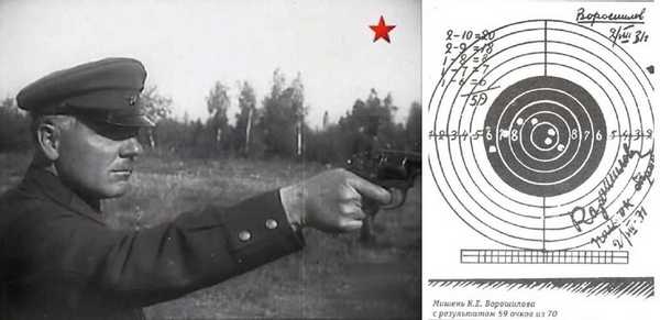 Ворошилов не стал спорить с проштрафившимся. Он просто молча выдернул из его трясущейся руки «никудышний» револьвер — и высадил в мишень весь барабан. Как видно из приведенного ниже фото, тот и вправду был пристрелян так себе. Потому-то Ворошилов и выбил «всего» 59 очков из 70 возможных.