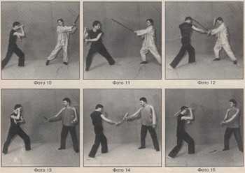 Пример 1. Противник атакует длинной палкой, размахивая ею по широкой траектории (фото 10). Уйдите от удара посредством отступления бросковым шагом назад (фото 11). Контратакуйте нападающего широким махом в голову (фото 12).