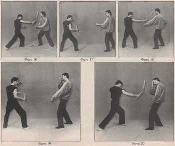 Пример 3. Противник угрожал нападением, и Вам пришлось выхватить нунчаку, взяв ее под контроль в положение подмышечного захвата (фото 17). Внимательно следите за противником. Вооруженный ножом, он может броситься на Вас. В данном случае он полез в карман. В подобной ситуации, если Ваши предварительные действия не возымели успеха и агрессор не отказался от своих планов нападения, целесообразно нанести упреждающий удар. Быть может нападающий полез за газовым баллончиком или пистолетом? Выполните короткий вертикальный мах в лицо (фото 18, 19). После этой атаки противник может отпрянуть назад. Забрасывайте нунчаку в положение плечевого захвата, одновременно делая скользящее перемещение к неприятелю. Добейте его широким махом (фото 20).