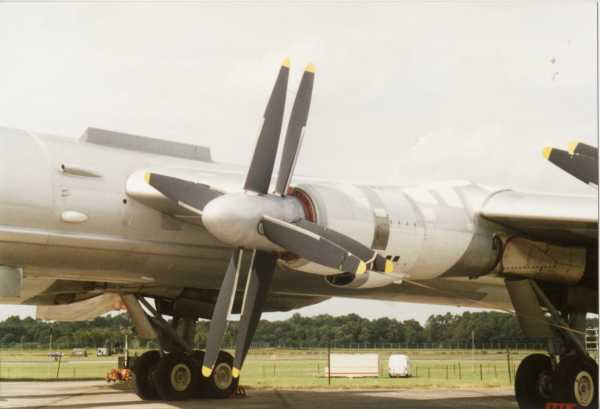 Единственным реально существовавшим в то время мощным отечественным ТВД был двигатель ОКБ Н.Д. Кузнецова ТВ-2Ф, имевший взлетную мощность 6250 э.л.с и являвшийся развитием германского проекта ТВД типа ЮМО-022. Для будущего Ту-95 требовался ТВД мощностью не менее 12000 э.л.с, поэтому для первой опытной машины решено было делать спарку из этих двигателей 2ТВ-2Ф, с дальнейшим переходом на перспективную разработку ТВ-12, обеспечивавшего необходимую мощность в одном агрегате. Одновременно разрабатывался уникальный редуктор для двигателя и винтовая группа с двумя огромными соосными четырехлопастными винтами противоположного вращения.