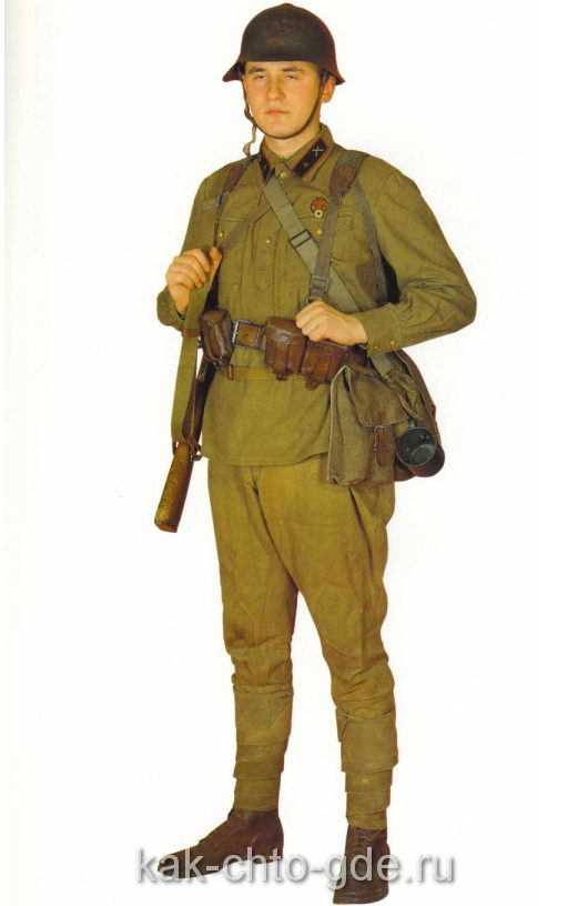 Стальной шлем модель 1936 года, с расширяющимися краями и небольшой гребень сверху. Гимнастёрка и брюки стандартны, характерные ромбовидные наколенники в коленях брюк, для более износостойкости. Петлицы воротника должны были с апреля 1941 года приглушенными в военно-полевых условиях, цвета хаки. Но старых фото видно, что они часто сохраняются вплоть до введения погон в 1943 году. Солдат носит обмотки, — которые были самых разных цветов, делались из всех видов изношенной формы и ботинки.