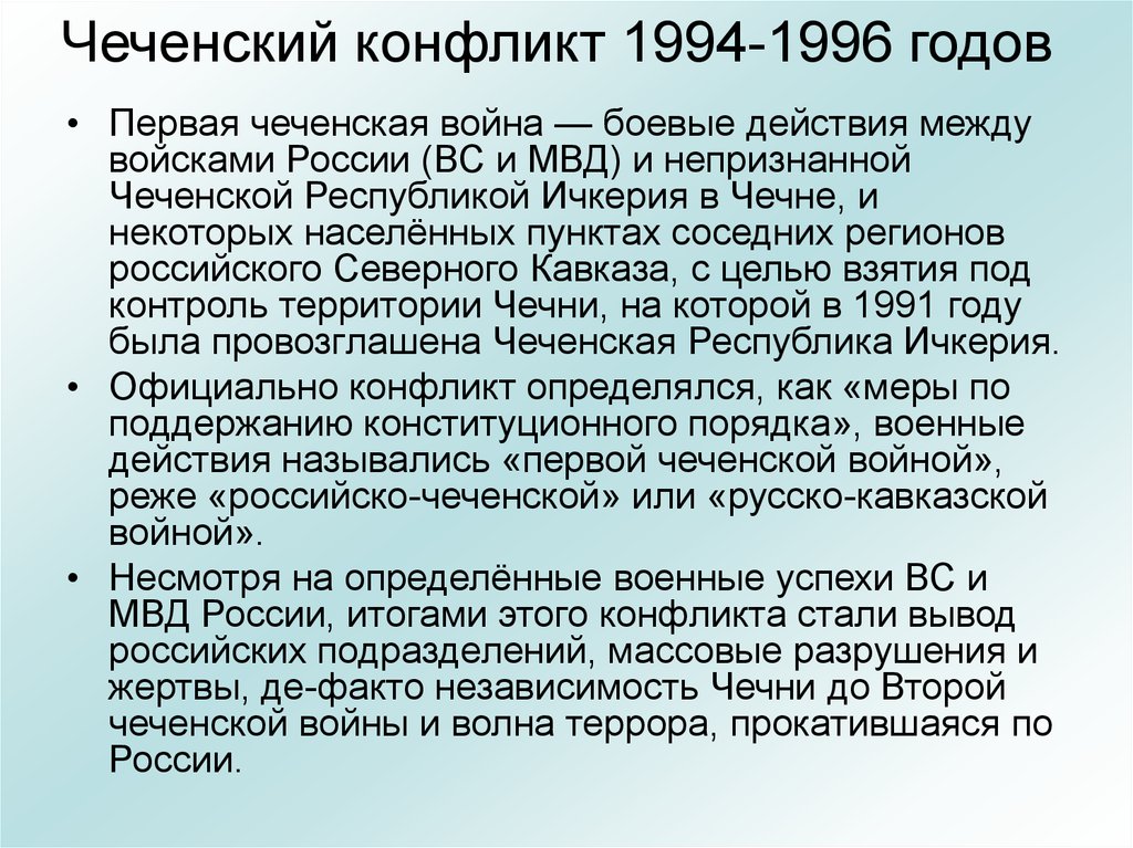 - в период вооруженного конфликта, с конца 1994 по конец 1996 гг. Это касается и прилегающих районов, которые поневоле были втянуты в боевые действия;