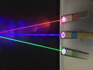 Лазерная указкаЛа́зерная ука́зка — портативный квантово-оптический генератор когерентных и монохроматических электромагнитных волн видимого диапазона в виде узконаправленного луча. В большинстве случаев изготавливается на основе красного лазерного диода, который излучает в диапазоне 635—670 нм, и коллиматора — двояковыпуклой линзы для организации узконаправленного луча. Сходное устройство имеют более редкие синие и фиолетовые указки и пока (2016) ещё более редкие зелёные. До начала-середины 2010-х годов зелёные лазерные указки имели сложное строение и представляли собой твердотельный лазер с накачкой инфракрасным лазерным диодом и последующим нелинейным элементом для удвоения частоты.