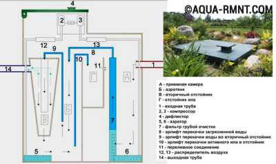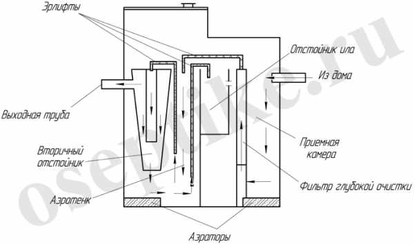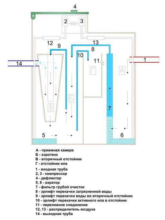 - По входной трубе (1) стоки поступают в приемную камеру (А). В нижней части отсека установлен аэратор (6), насыщающий активный ил пузырьками воздуха. На этом участке происходит первый этап очистки, причем в работу уже на этой стадии вступают микроорганизмы. Они расщепляют органические соединения, измельчая таким образом крупные частицы стоков. Далее, жидкость через фильтр грубой очистки (7) с помощью эрлифта (8) перекачивается на следующий участок (в камеру Б).