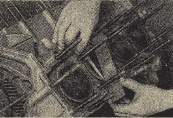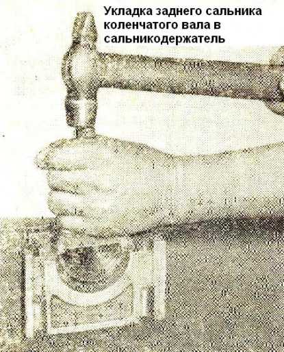 В качестве заднего сальника на двигателях применяют асбестовый шнур, пропитанный маслянографитовой смесью. В гнёзда блока цилиндров и сальникодержателя укладывают шнур длиной 140 мм. При помощи приспособления шнур опрессовывают в своих гнездах лёгкими ударами молотка, как указано на рис. 24. Не снимая приспособления, подрезают концы шнура заподлицо с плоскостью разъёма сальникодержателя. Срез должен быть ровным, разлохмачивание концов и неровный срез не допускаются.