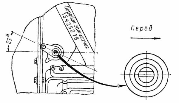 - Закрепить корпус привода держателем и гайкой так, чтобы кронштейн с резьбовым отверстием для крепления прерывателя-распределителя был направлен назад и повернут на угол 23° влево от продольной оси двигателя, как показано на рис. 29.