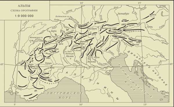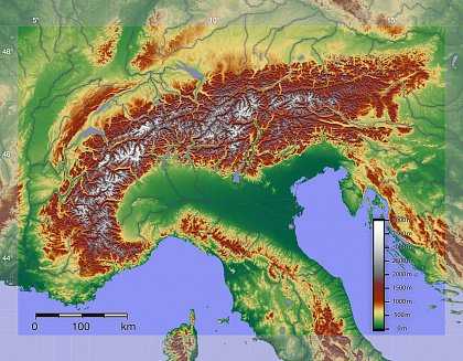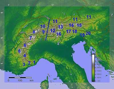 Поперечной долиной между Боденским озером и озером Комо Альпы разделяются на более высокие Западные Альпы (высота до 4808 м, гора Монблан) и более низкие и широкие Восточные Альпы (высота до 4049 м, гора Бернина)