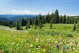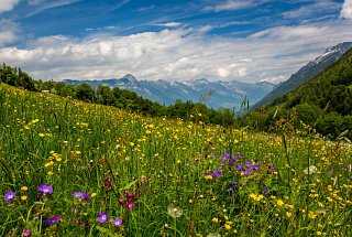 В районах Альпийских гор учёными выявлено 13 000 видов растений[18]. Альпийские растения сгруппированы по среде обитания и типу почвы, который может быть известковым (известняк) или не известковым. Растения обитают в различных диапазонах природных условий: от луга, болота, леса (лиственные и хвойные) и районов, не затронутых осыпями и лавинами, до скал и хребтов[19]. Благодаря наличию высотной поясности разнообразие и специфика альпийской флоры, в основном, зависит от высоты над уровнем моря. В Альпах встречаются самые разные биотопы — луга, которые покрыты цветами ярких расцветок в долинах, и высокогорные районы, обладающие скромной растительностью. До высоты 2400 метров над уровнем моря растут хвойные деревья. Выше, до 3200 метров, ещё встречаются карликовые деревья. Одно из самых известных горных растений — это ледниковый лютик, который является рекордсменом среди растений и встречается до высоты 4200 метров. Небольшие группы растений встречаются на высоте 2800 метров. Многие из них, например, незабудочник и смолка, имеют особую подушковидную форму, которая защищает их от травоядных животных, живущих на этих высотах, и потери влаги. Таким образом молодые побеги также защищены от ветра и мороза. Известный эдельвейс покрыт слоем белых волосков, которые хорошо удерживают тепло.