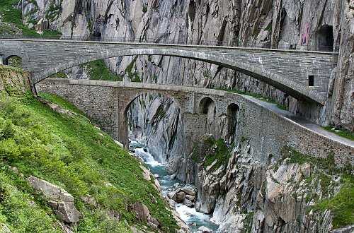 Мост Дьявола на пути к перевалу Готард. Это третий мост в этом месте, который был взведен в 1958 году. Первый мост датировался 1595 годом