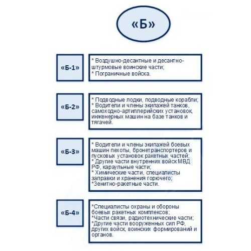 В категории Б существует 4 подкатегории, каждая из которых относится к определенному роду войск и дается по разным болезням: