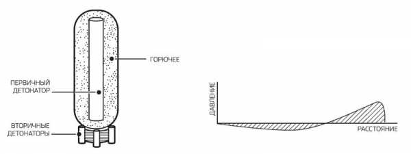 А из школьного курса физики можно было бы узнать, что за любой ударной волной (зоной сжатия) в обязательном порядке следует зона разрежения — по закону сохранения масс. Просто взрыв бризантного взрывчатого вещества (ВВ) можно считать точечным, а объемно-детонирующий заряд в силу большого объема формирует более длительную ударную волну. Именно поэтому воронок он не роет, но деревья валит. А вот бризантного (дробящего) действия вообще практически нет.