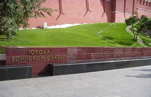 Могила Неизвестного СолдатаСправа находится стела из красного гранита, лежащая на постаменте (установлена в 2010 году). С ее левой стороны надпись «Города воинской славы». Вдоль постамента идут названия городов воинской славы.