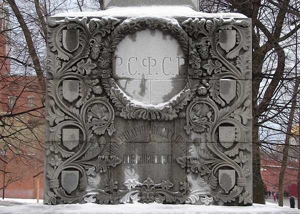 Так, герб Романовых и гербы губерний страны были заменены шаром, а обелиск был украшен рельефным орнаментом с надписями: «Пролетарии всех стран, соединяйтесь» и «РСФСР» и получил название Обелиск «Борцам-мыслителям».
