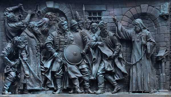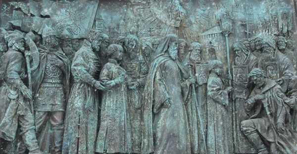 По двум сторонам постамента расположены бронзовые барельефы, на которых изображены: сцена избрания М. Романова царем Руси; сцена изгнания Патриархом Гермогеном бояр, которые просили у него благословения перейти в подданство Владиславу – польскому королевичу.