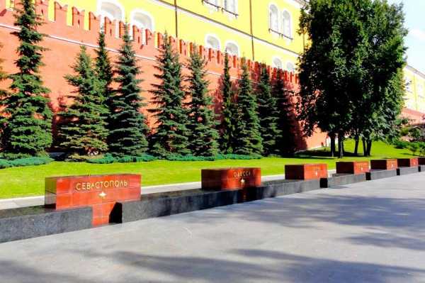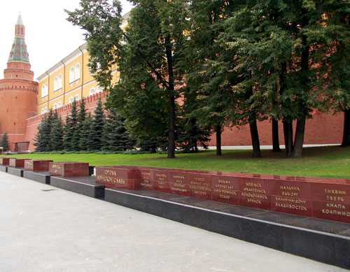 Могила Неизвестного Солдата. Брестская крепостьВдоль Кремлевской стены протянулась площадка, поднятая тремя ступенями над уровнем дорожек Александровского сада. На площадке установлены десять блоков из тёмно-красного шокшинского кварцита. На каждом блоке рельефная бронзовая надпись – название города-героя. Внутри блоков находятся капсулы с землей из этих городов.