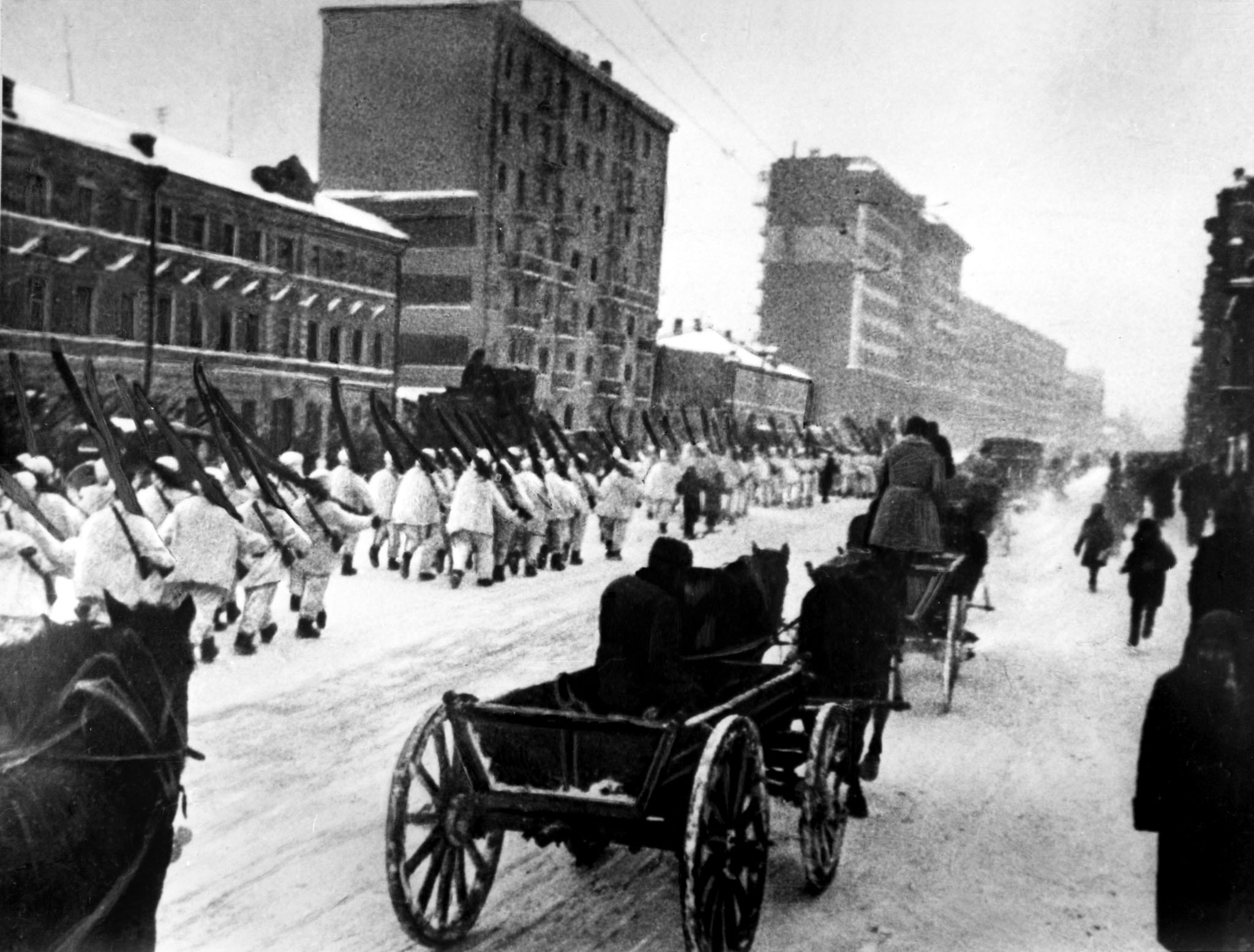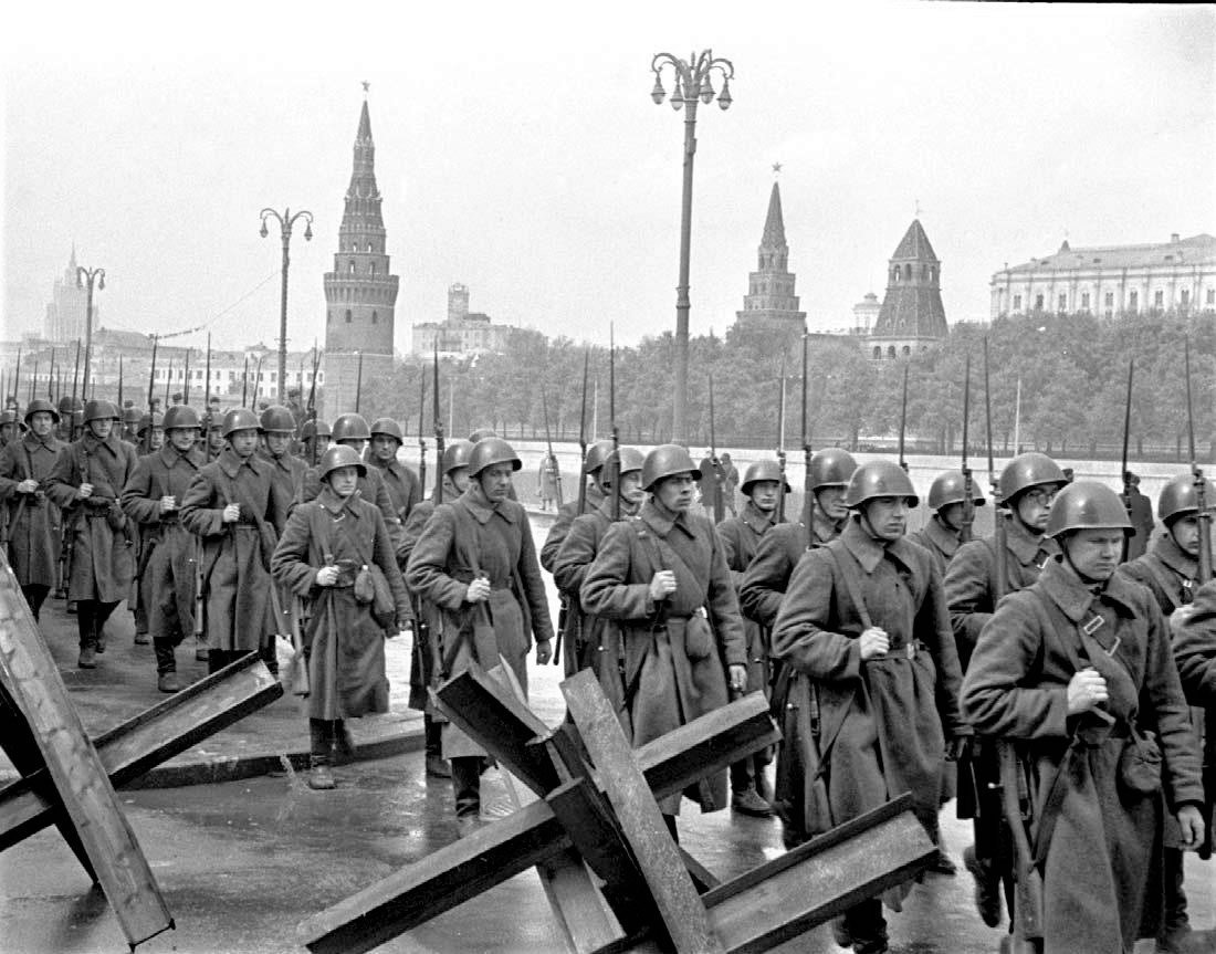 Решение Сталина остаться в Москве помогло успокоить нараставшую в городе панику, и он произнес несколько волнующих патриотических речей перед войсками, направлявшимися на фронт, например, здесь, на Красной площади, 7 ноября 1941 года.