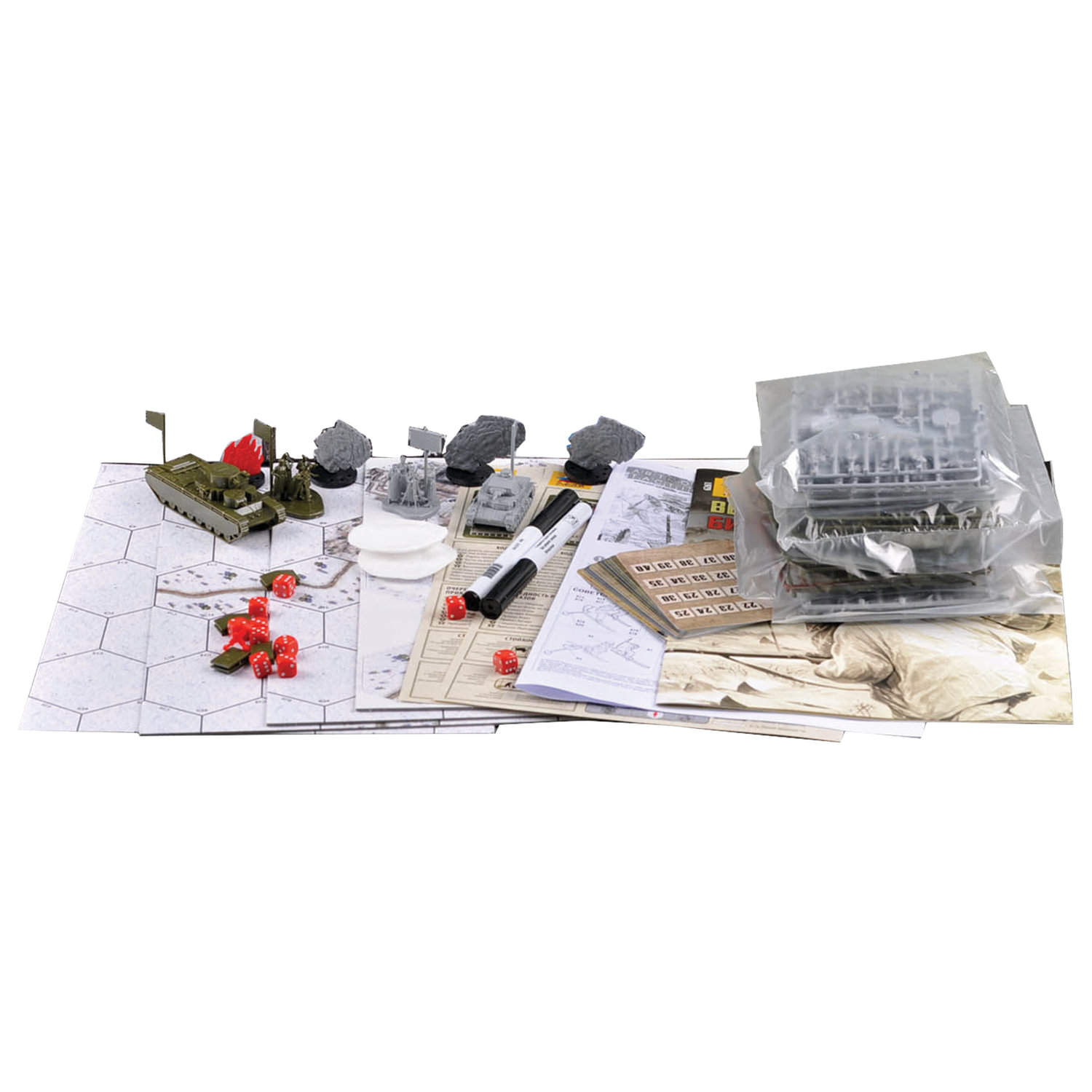 Игровой набор военно-исторической игровой системы «Великая Отечественная».Модели в составе набора: 28 фигур пехоты, модель немецкого танка и модель советского танка, 6 фишек дыма и 2 фишки огня, 3 двусторонних игровых поля, 30 элементов местности и 3 элемента высот, 15 игровых карточек, 2 памятки игроков, 10 кубиков, книга сценариев и книга правил.