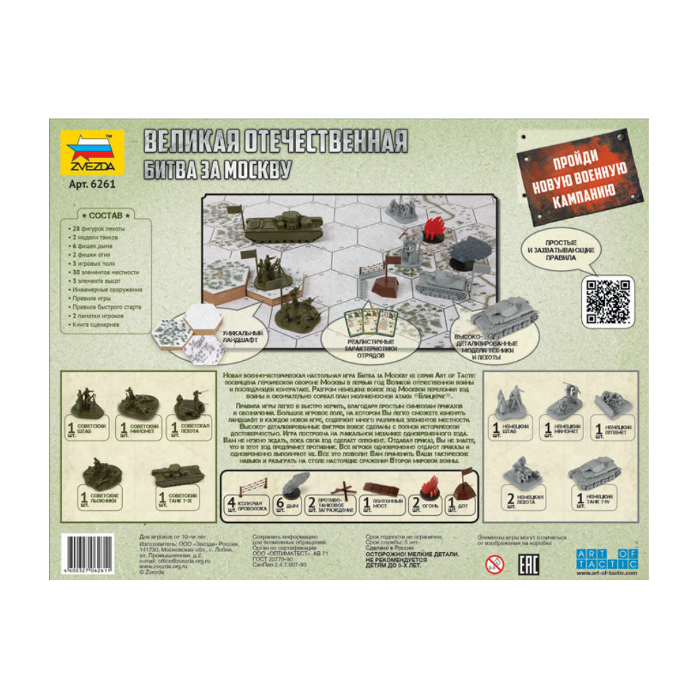 Военно-историческая настольная игра «Битва за Москву» из серии Art of Tactic посвящена героической обороне Москвы в первый год Великой отечественной войны и последующей контратаке. Разгром немецких войск под Москвой переломил ход войны и окончательно сорвал планы молниеносной атаки «Блицкриг». Правила игры легко и быстро изучить, благодаря простым символам приказов и обозначений. Большое игровое поле, на котором вы легко сможете изменять ландшафт в каждой новой игре, содержит много различных элементов местности. Высоко-детализированные фигурки войск сделаны с полной исторической достоверностью.