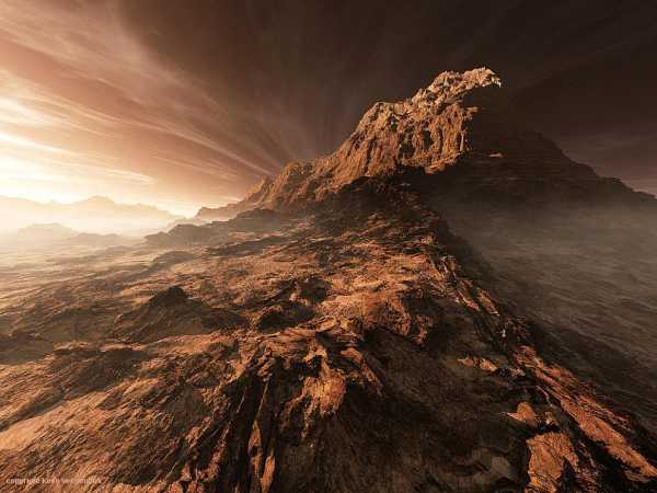 27. Гора Олимп в древности. Так могла бы выглядеть гора Олимп около 4 миллиардов лет назад. Присутствуют вода и более плотная атмосфера. Фотография выполнена для выставки в мадридском планетарии.