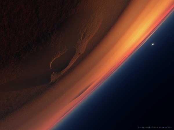 Источник: earthsky.orgНа этом изображении показана турбулентная масса толстой, рыхлой, красной марсианской пыли, поднимающейся из сети каньонов и протекающей по диагонали в нижний левый угол рамы.