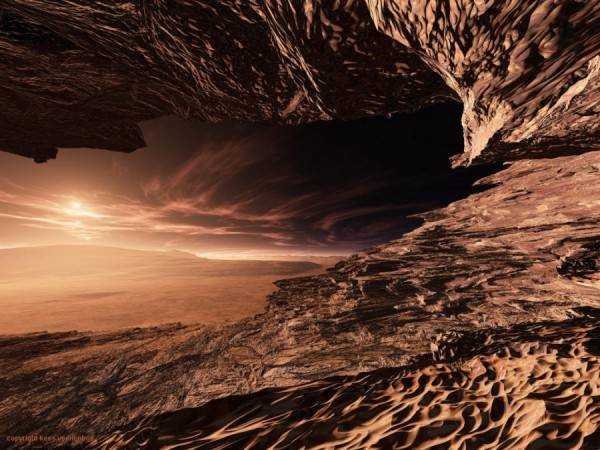 9. Пещера, находящаяся на северном склоне марсианского кратера Гейла. Вид пещеры на северном склоне кратера Гейла. Конус кратера Гейла – слева.