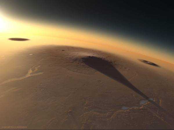 Гора Олимп — потухший вулкан на Марсе, расположенный в провинции Фарсида, самая высокая гора в Солнечной системе. Высота Олимпа — 21,2 км по отношению к его основанию, что более, чем вдвое больше высоты Эвереста. Это изображение показывает, как могла бы выглядеть эта гора в древности, 4 миллиарда лет назад: