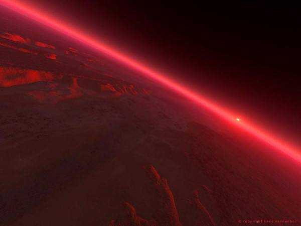 10. Рассвет на горе Элизий. Изображение выполнено для выставки в мадридском планетарии, которая была посвящена Марсу. Слева — вулкан Купол Гекаты, справа — Купол Альбор.