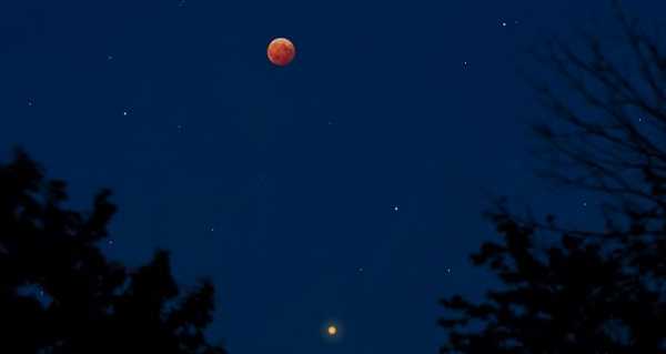 Источник: news.liga.netВ этот момент он мог бы превзойти красавицу-Венеру, если бы та оказалась в этот момент рядом. На фото отчётливо видно кровавую Луну и красную планету, которая находится немного ниже в южной части ночного неба.