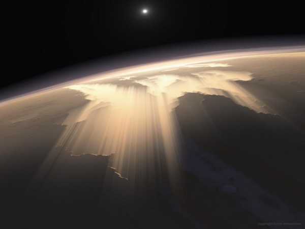 1. Южная оконечность кратера Холдена. Скалистые горы закрывают солнце, которое прорывается сквозь облака, образуя форму звезды.