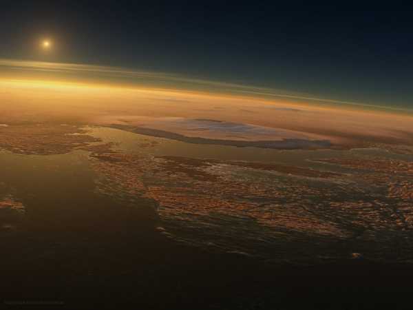 4. Ноачианская эпоха на Марсе. Так выглядел Марс около 4 миллиардов лет тому назад. Северный разлом заполнен водой, большое озеро внизу — это Меридиани. Марсоход Opportunity обнаружил присутствие этого внутреннего моря. Фотография выполнена для июльского выпуска National Geo. за 2005 год.