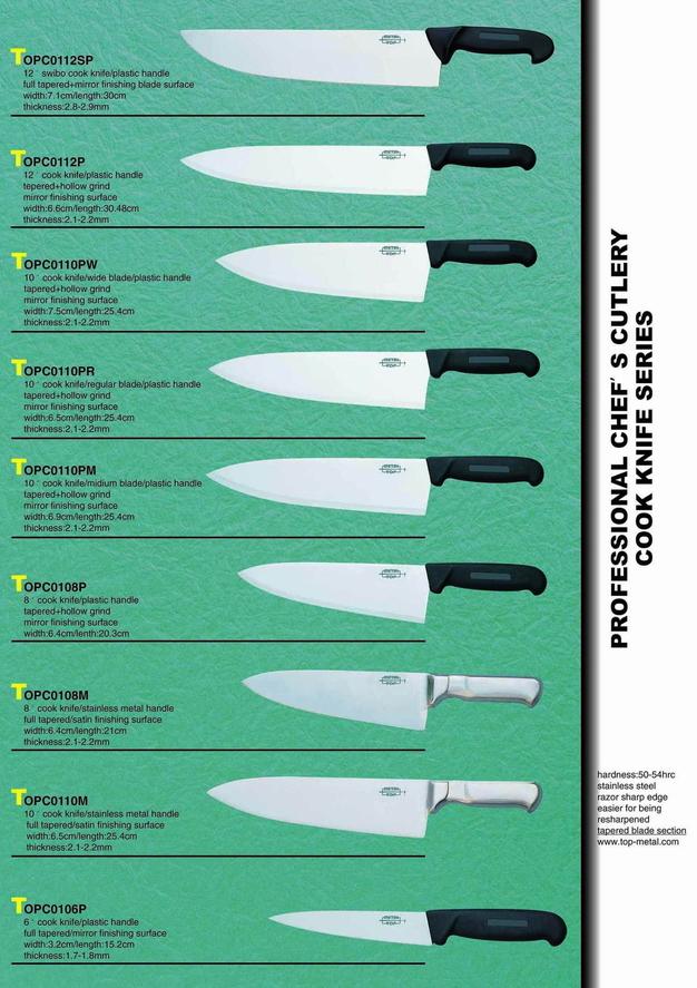 Поварской нож (шеф-нож)Шеф-ножОдин из основных ножей, который должен быть на каждой кухне. Длина клинка варьируется от 15 до 30 см (6-12 дюймов), толщина — 2-4 мм, ширина (высота) — в среднем 40-47 мм. С увеличением длины обычно увеличивается и толщина, и ширина ножа. Широкое лезвие бывает полезно — его можно использовать как лопатку для переноса продуктов.