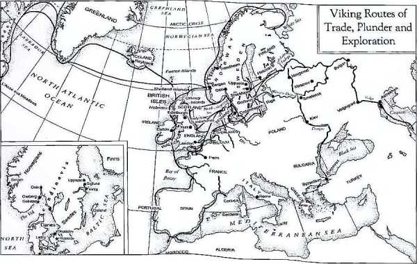 Когда кто-нибудь берется описывать Скандинавию в преддверии наступления эры викингов, возникает соблазн разделить ее на три части, населяемые датчанами, норвежцами и шведами. Подобная тенденция в значительной мере обусловлена средневековой историей. Главным различием викингов из тех или иных регионов является язык — лингвистические особенности восточных и западных скандинавских диалектов. Картина осложняется довольно ранним появлением централизованной монархии в Дании. Признаки формирования там государственности на уровне, превышавшем бы клановый или племенной, отмечаются в «Франкских королевских анналах». Изъявление покорности Годфреда Датского Карлу Великому рассматривалось хронистом как действия государя всего Датского королевства (Годфред, или Гудфред, правил в конце VIII — начале IX века и успешно воевал с каролингской империей. — Прим. пер.). Наличие довольно концентрированной власти в руках датского монарха очевидно в восстановлении так называемой даневирке (danevirke) — довольно мощной и построенной еще до викингов фортификационной линии, отделявшей Ютландию от остальной Европы.