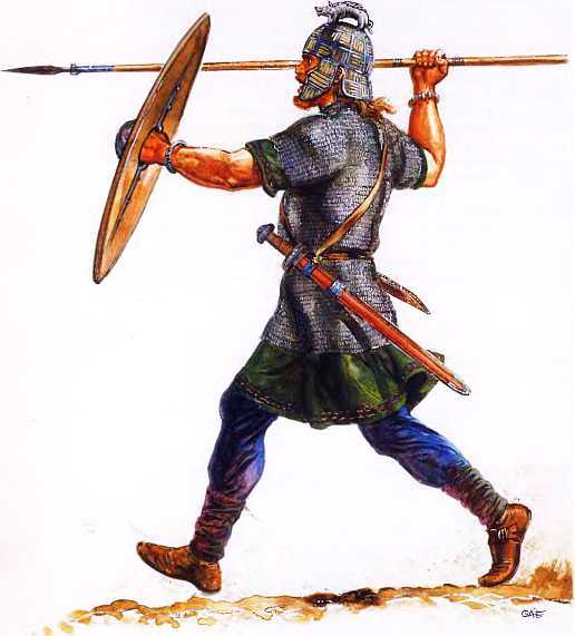 Скандинавский воин VI–VII столетний. Рисунок сделан на основе изображений копейщиков на блюдах из Торслунда времен до эры викингов в Швеции. Показанный здесь воин среднего статуса нашел смерть за сотни лет до нападения на Линдисфарн, а посему он вполне вправе рассчитывать на то, чтобы считаться «предком» викингов.