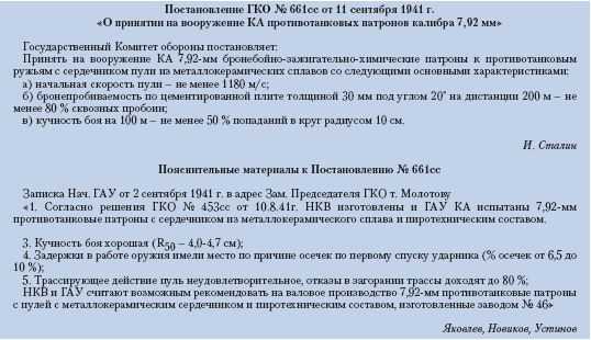 меры наладить серийное производство 7,92мм германского противотанкового ружья PzB 39 и патронов к нему(в июле В. А. Дегтярёву и С. Г. Симонову была поставлена задача по разработке ПТР в калибре 14,5 мм). Секрет PzB 39 оказался прост – высокая начальная скорость пули, «помноженная» на большую массу сердечника, изготовленного из особо твёрдого сплава с большим удельным весом (15 г/см3). «Немцы широко применяют на активную (бронепробивную) часть как пуль, так