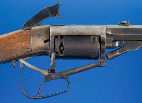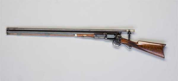 Оригинальные револьверные винтовки выпускали в то время и другие конструкторы. Так, в 1855 году Александром Холлом в Нью-Йорке была выпущена вот эта винтовка с барабанным магазином, рассчитанным на 15 зарядов! Винтовка, как это хорошо видно, инкрустирована различными фигурками и, по-видимому, представляет собой штучную работу.