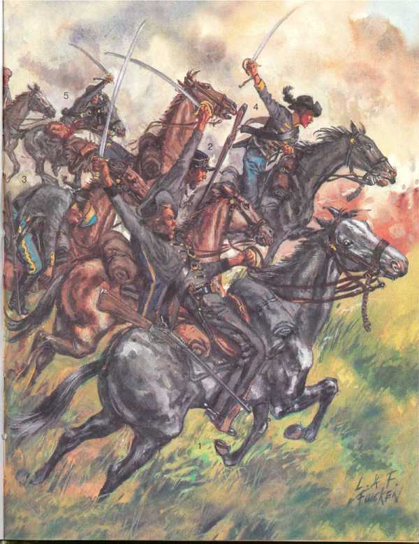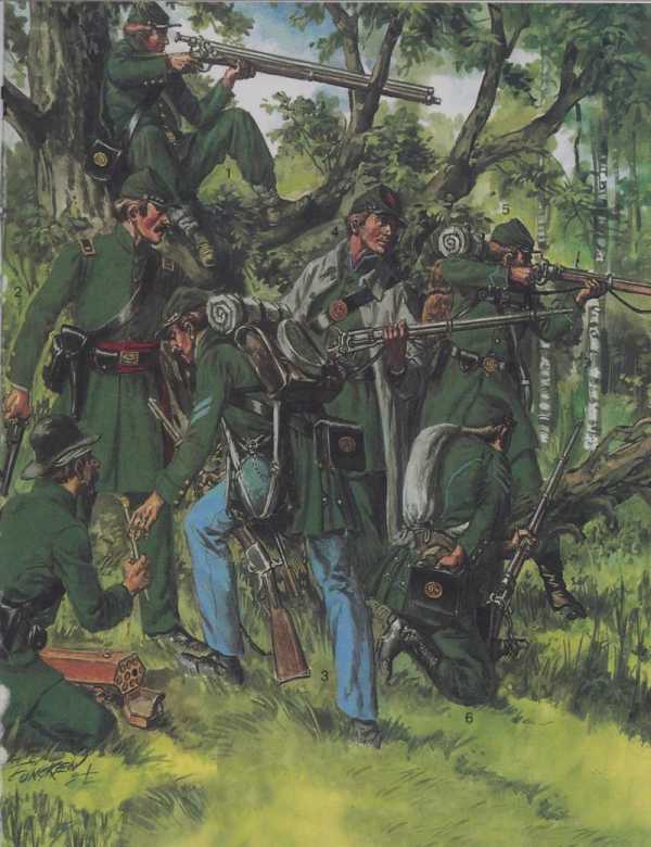 Отборные стрелки Бердана. Солдат (4) как раз вооружен винтовкой Кольта с барабаном на пять выстрелов М1855 калибра .56 (14,22-мм) – основным оружием корпуса Бердана. Рис. Л. и Ф. Функенов. После начала войны армия Союза приобрела еще много винтовок и карабинов Кольта. Источники сообщают о примерно 4,400 – 4,800 экземплярах, приобретенных в общей сложности в течение всей войны. Эффективность этого оружия показали, например, действия 21-ого добровольческого пехотного полка штата Огайо на склоне Снодграсс во время битвы при Чикамауге. Полк вел огонь такой интенсивности, что войска Конфедерации были убеждены, что они атакуют целую дивизию, а не всего один полк. Правда, затем у северян закончились боеприпасы, и они сдались. Тем не менее недостатки винтовки были также очевидны, и после окончания войны все оставшиеся экземпляры были распроданы в частные руки по цене 42 цента каждая, при изначальной их стоимости в 44 доллара.