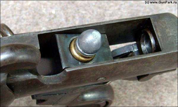 43. Австрийский пистолет М1885 системы Шульхофа, перезаряжался передергиванием кольца.