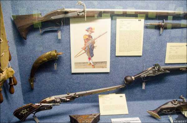 7. Сверху прусское пехотное ружье средины XVIII века, ниже прусский гусарский карабин (1750) и саксонский кавалерийский пистолет М1763.