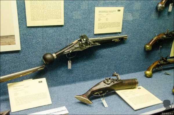 4. Пистолет с колесцовым замком для конной гвардии саксонского курфюрста Кристиана I (1598) и снизу массивный дробовой пистолет (1650).