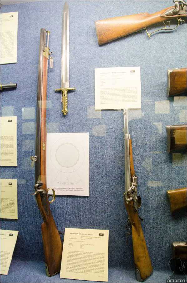 10. Вюртембергский нарезной штуцер М1846 с тесаком и справа австрийский кавалерийский карабин М1851 системы Августина.